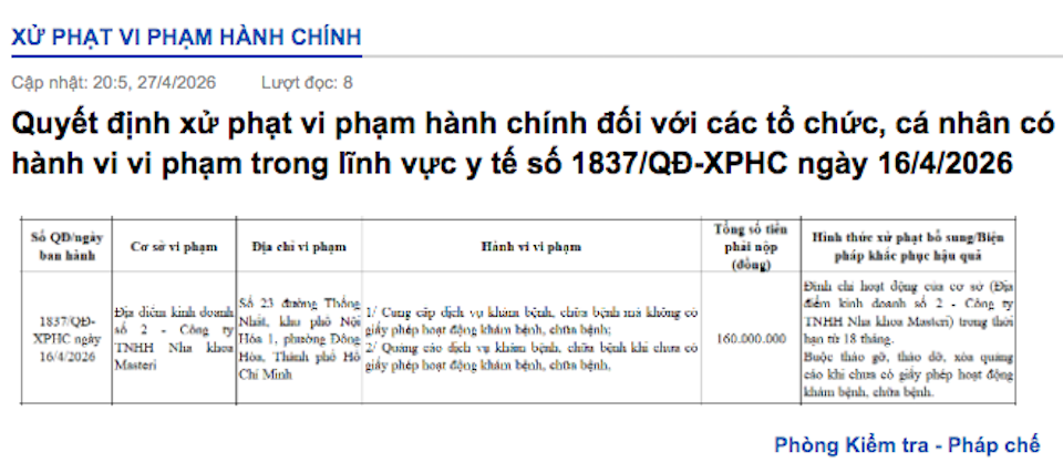 Theo quyết định xử phạt số 1837 ban hành ngày 16/04/2026, Địa điểm kinh doanh số 2 - Công ty TNHH Nha khoa Masteri (tại số 23 đường Thống Nhất, khu phố Nội Hóa 1, phường Đông Hòa, TP Hồ Chí Minh) là đơn vị chịu mức phạt cao nhất trong đợt thanh tra này với tổng số tiền lên đến 160.000.000 đồng.