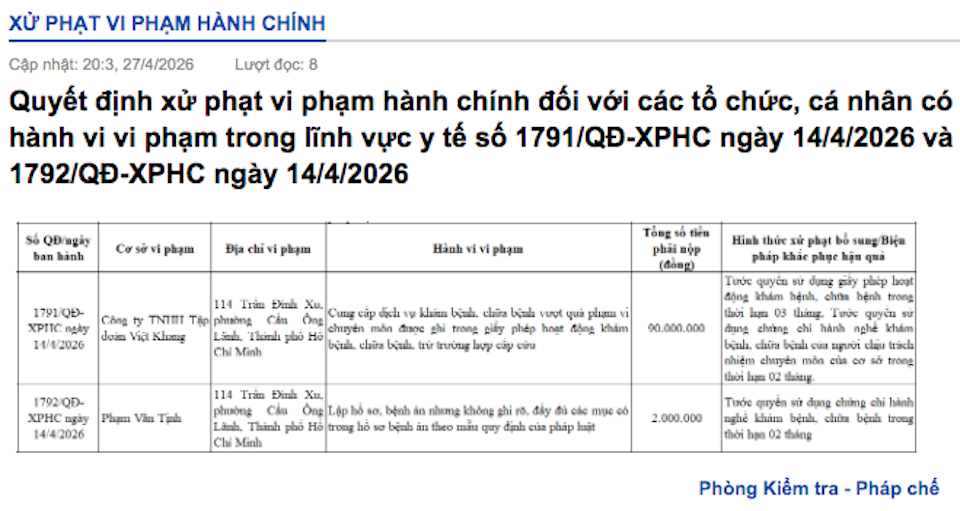 Cùng trong đợt rà soát này, nhiều đơn vị và cá nhân khác cũng bị "điểm tên" do vi phạm các quy định về quản lý y tế. Công ty TNHH Tập đoàn Việt Khang (114 Trần Đình Xu, phường Cầu Ông Lãnh, TP Hồ Chí Minh) bị xử phạt 90.000.000 đồng và bị tước giấy phép hoạt động 03 tháng do cung cấp dịch vụ vượt quá phạm vi chuyên môn được cấp phép. Người chịu trách nhiệm chuyên môn tại đây là ông Phạm Văn Tịnh cũng bị tước chứng chỉ hành nghề 02 tháng.