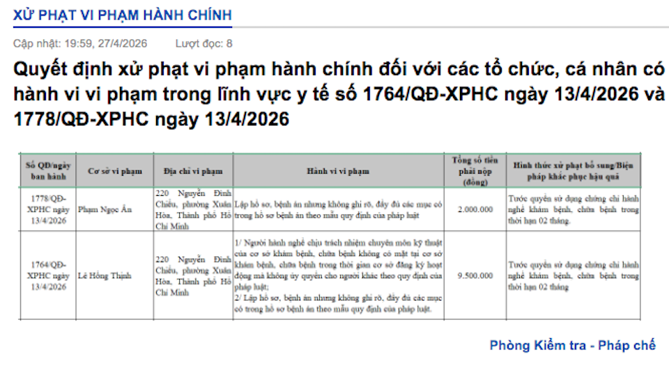 Công ty TNHH The Strong World (220 Nguyễn Đình Chiểu, phường Xuân Hoà, TP Hồ Chí Minh) bị phạt 12.000.000 đồng vì để người hành nghề không đăng ký theo quy định và không lập sổ khám bệnh. Liên quan đến địa chỉ này, các bác sĩ Phạm Ngọc Ân và Lê Hồng Thịnh đều bị xử phạt và tước chứng chỉ hành nghề 02 tháng do những sai phạm trong việc lập hồ sơ bệnh án và vắng mặt trong giờ đăng ký hoạt động.