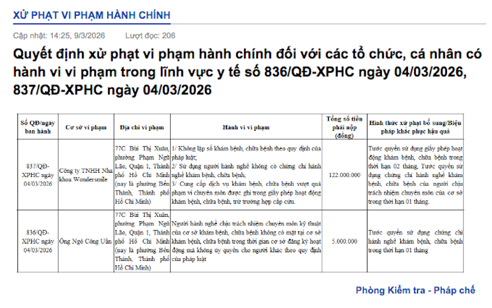 Nha khoa Wondersmile bị xử phạt 122 triệu đồng và tước giấy phép 2 tháng do sử dụng nhân sự không chứng chỉ hành nghề và hoạt động vượt phạm vi chuyên môn. Nguồn: Sở Y tế TP Hồ Chí Minh