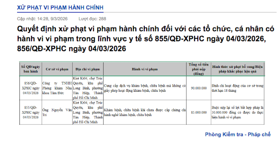 Phòng khám Nha khoa Tâm Đức (địa chỉ Kiot Kt04, chợ Trúc Quyên, khu phố Long Bình, phường Tân Hiệp, TP Hồ Chí Minh) bị phạt 90 triệu đồng và đình chỉ hoạt động trong 18 tháng do cung cấp dịch vụ khám chữa bệnh khi chưa có giấy phép. Cá nhân ông Nguyễn Văn Tri tại đây cũng bị phạt 85 triệu đồng vì hành nghề "chui" và buộc nộp lại 50 triệu đồng lợi nhuận bất hợp pháp.