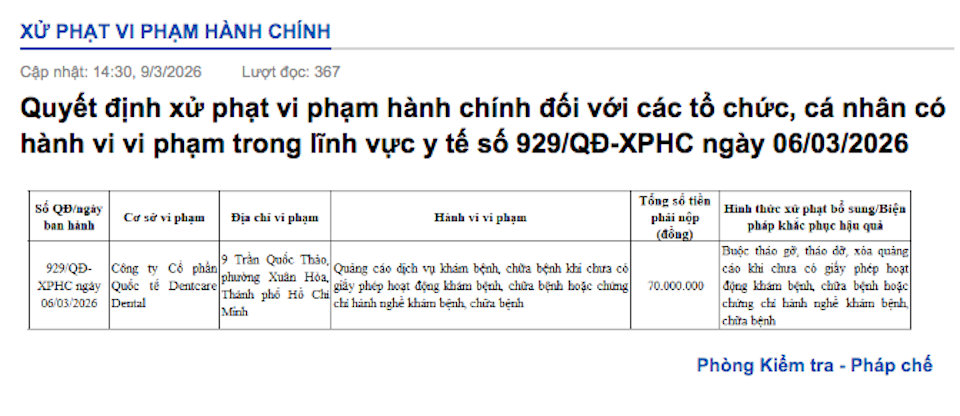 Công ty Cổ phần Quốc tế Dentcare Dental (9 Trần Quốc Thảo, phường Xuân Hòa, TP Hồ Chí Minh) bị phạt 70 triệu đồng do quảng cáo dịch vụ khi chưa có giấy phép hoặc chứng chỉ hành nghề, buộc phải gỡ bỏ toàn bộ nội dung quảng cáo vi phạm.