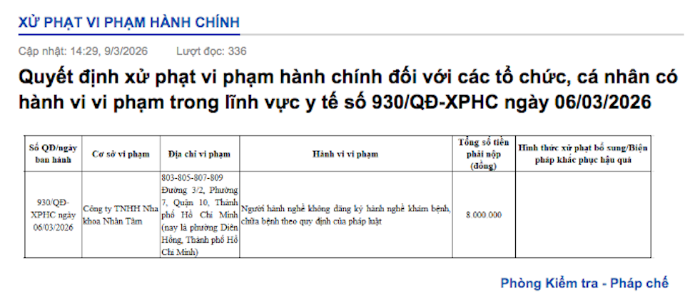 Nha khoa Nhân Tâm (địa chỉ 803-805-807-809 đường 3/2, phường Diên Hồng, TP Hồ Chí Minh) bị xử phạt 8 triệu đồng vì có người hành nghề không đăng ký theo quy định.