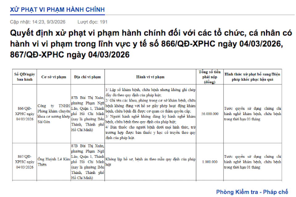 Phòng khám chuyên khoa Cơ xương khớp Sài Gòn (địa chỉ 87B Bùi Thị Xuân, phường Bến Thành, TP Hồ Chí Minh) bị xử phạt 56 triệu đồng. Các lỗi vi phạm được xác định gồm: ghi chép sổ khám bệnh không đầy đủ, đặt tên khoa phòng không đúng hồ sơ cấp phép, người hành nghề không đăng ký và bán thuốc cho người bệnh dưới mọi hình thức (trừ thuốc y học cổ truyền). Tại đây, ông Huỳnh Lê Kim Thiên cũng bị phạt 1 triệu đồng và tước chứng chỉ hành nghề 1 tháng do không lập hồ sơ bệnh án theo mẫu.
