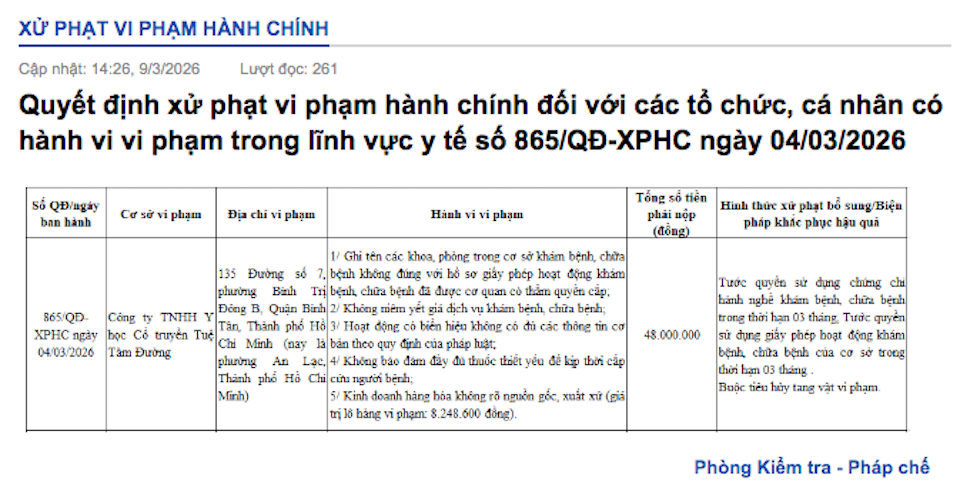 Công ty TNHH Y học Cổ truyền Tuệ Tâm Đường (135 Đường số 7, phường An Lạc, TP Hồ Chí Minh) bị phạt 48 triệu đồng do mắc hàng loạt sai phạm như: không niêm yết giá dịch vụ, biển hiệu thiếu thông tin, không đảm bảo thuốc thiết yếu cho cấp cứu và kinh doanh hàng hóa không rõ nguồn gốc. Hậu quả là công ty bị tước giấy phép hoạt động và chứng chỉ hành nghề trong 3 tháng, đồng thời buộc tiêu hủy tang vật vi phạm.