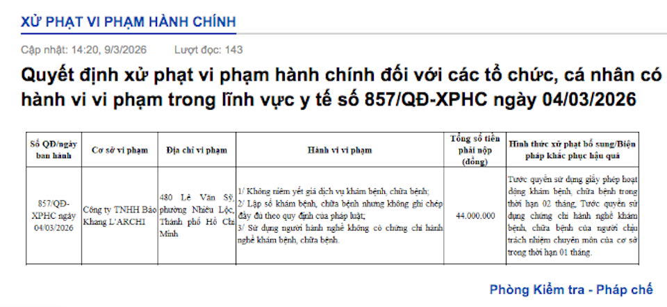 Cơ sở Bảo Khang L'ARCHI bị xử phạt 44 triệu đồng và tước quyền sử dụng giấy phép hoạt động trong thời hạn 2 tháng. Nguồn: Sở Y tế TP Hồ Chí Minh
