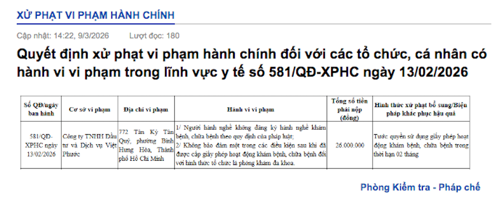 Công ty TNHH Đầu tư và Dịch vụ Việt Phước (772 Tân Kỳ Tân Quý, phường Bình Hưng Hòa, TP Hồ Chí Minh) bị phạt 26 triệu đồng và tước giấy phép hoạt động 2 tháng do không đảm bảo điều kiện sau khi đã được cấp phép phòng khám đa khoa và có người hành nghề không đăng ký.